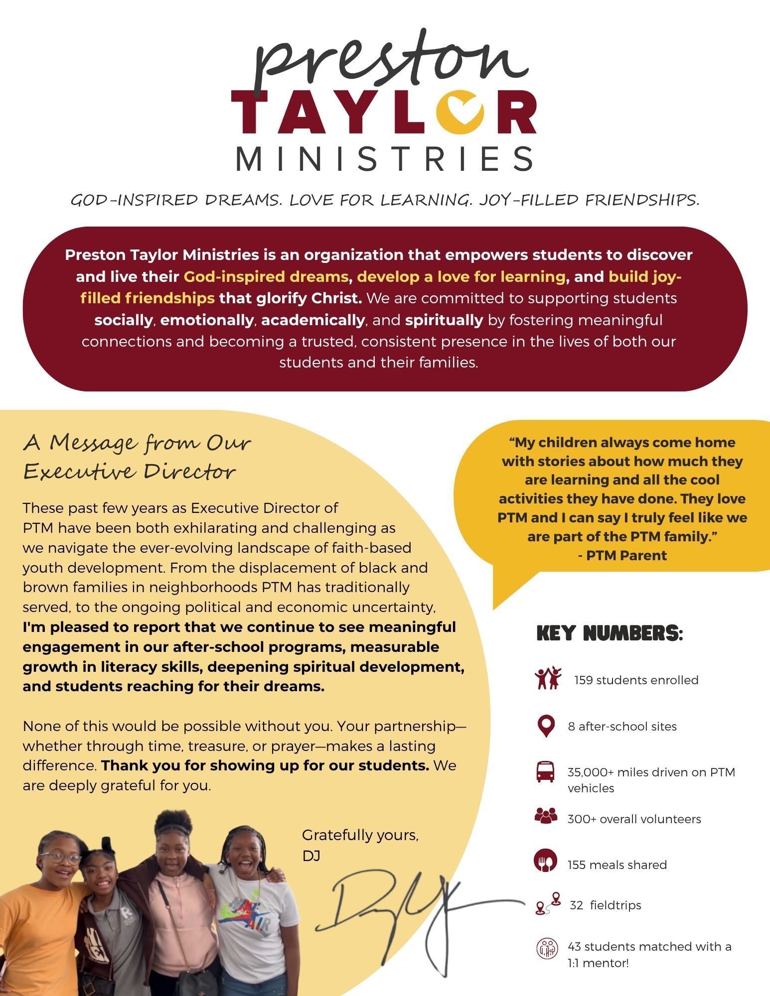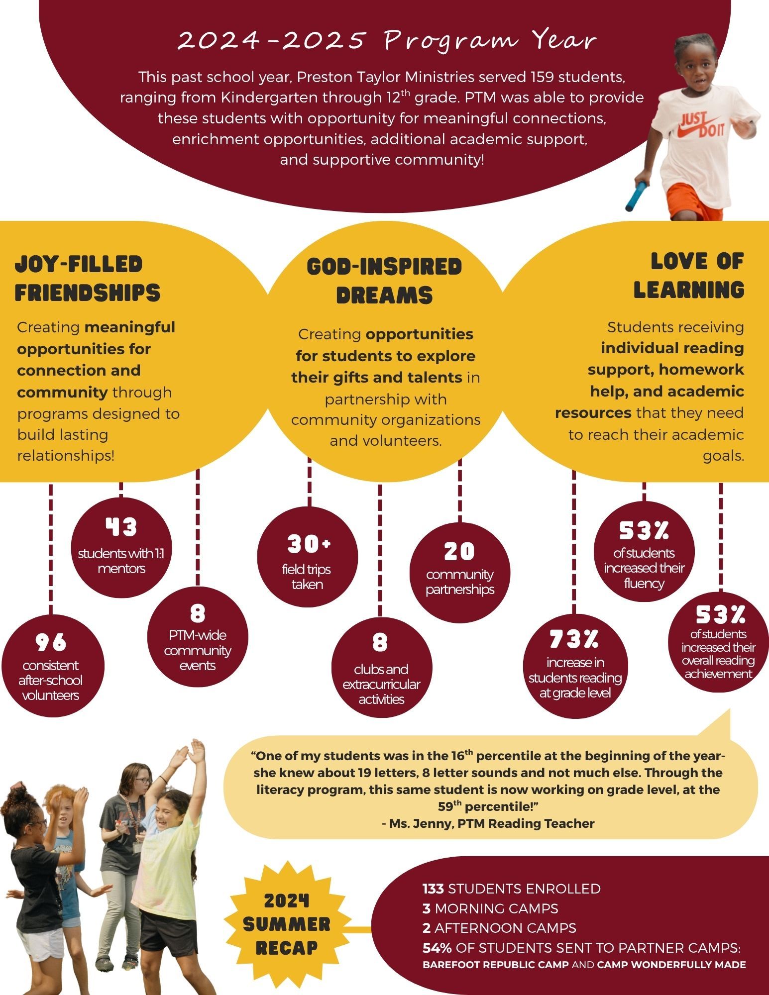 PTM exists to be a place for students to receive support socially, emotionally, academically and spiritually. PTM ended the 2024-25 program year with 159 students enrolled, and 53% of these students were deeply connected through programs ranging from mentorship, enrichment opportunities, summer camps and more. Read more about PTM's impact through the 2024-2025 Impact Report.